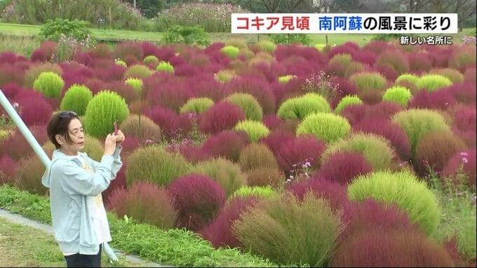 コキアはこのところの涼しさで緑から赤く色づき、秋が深まる南阿蘇の景色に彩りを添えています。