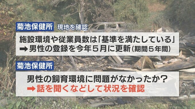 今回の火事では約100匹の犬が死んだとみられていますが、管轄する菊池保健所は、現地を確認した上で施設の環境や従業員数が「基準を満たしている」として、登録を今年5月に更新しています。※期間は5年間