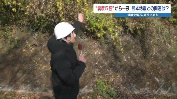 最大震度5強の揺れを観測した熊本県産山村の今朝(26日)の様子です。大きな岩が県道を塞ぎ、全面通行止めとなっていました。