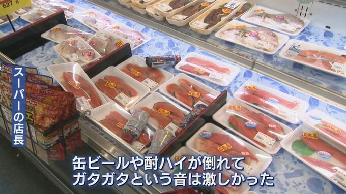 阿蘇市内牧のスーパーマーケットでは、店員が倒れた商品を元に戻す様子も。