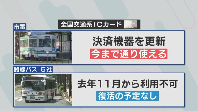 熊本県内の路線バスでは、2024年11月から、全国交通系ICカードが利用できなくなっていますが、県内のバス会社5社でつくる共同経営推進室は「新たなタッチ決済を導入したばかりで、今のところ全国交通系ICカードを復活させる予定はない」としています。