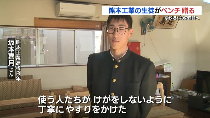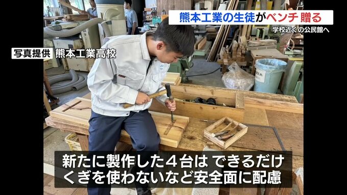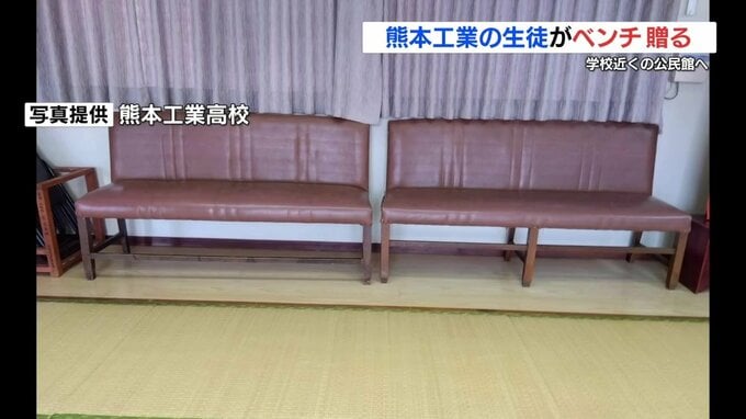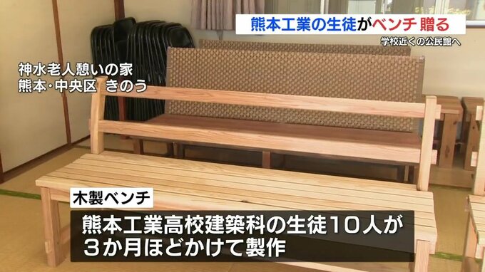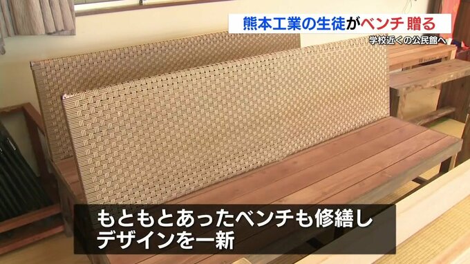熊本工業高校の生徒たちが作った木製のベンチが、学校近くの公民館に贈られ、地域の人たちを喜ばせています。