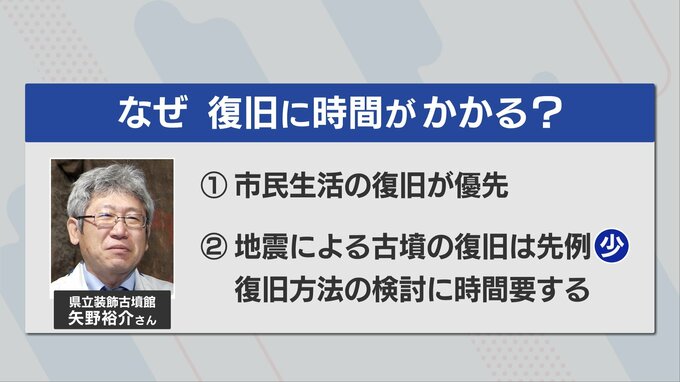 理由として、矢野さんは「市民生活の復旧を優先すると、文化財の復旧はどうしても遅れてしまうこと」、「地震による古墳の復旧は全国にも先例が少なく、復旧方法の検討に時間がかかること」を挙げました。