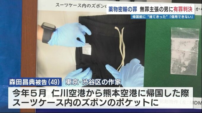 判決によりますと、東京都渋谷区の作家、森田昌典被告(49)は今年5月、韓国の仁川空港から旅客機で熊本空港に帰国した際、機内に預けたスーツケース内のズボンのポケットに合成麻薬のMDMA0.24gと、麻薬のケタミン0.21gを入れて密輸した罪に問われています。