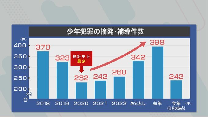 熊本県警によりますと、少年犯罪の摘発・補導件数は、コロナ禍の2020年に232人と統計史上最も少なくなりましたが、翌年から増加に転じ、今年は6月末の時点で去年の同じ時期の1.5倍になっています。