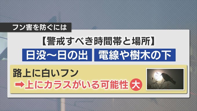カラスのフン被害「電柱や木の下」は避けて通って! 冬の熊本城下町に1万羽が飛来・・・市役所6年目の防衛作戦は“先手必勝” 2025年12月3日(水) 19:15 国内 フン被害にあわないための注意点 警戒すべき時間帯は日没から日の出まで、ねぐらがある電柱や樹木の下は特に注意が必要です。 路上にフンがあれば、その上にカラスがいる可能性が高いため、避けて通ることが重要です。
