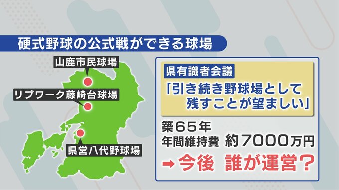 県の有識者会議は、「県営野球場は藤崎台から別の場所への移転が最も適当」とする一方、県内の球場の少なさから、「藤崎台は引き続き残すことが望ましい」とも提言しています。