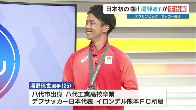デフリンピック・サッカー男子で銀メダルを獲得した湯野琉世選手(熊本県八代市出身)に、RKK熊本放送が、テレビ番組「NEWS ゲツキン」でインタビューをしました。