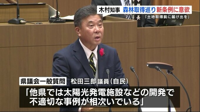 そのため4日の県議会一般質問で、自民党の松田三郎議員は「他県では太陽光発電施設などの開発で不適切な事例が相次いでいる」として、県内での対策を求めました。