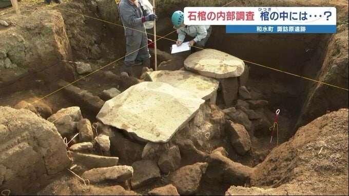 熊本県和水町にある諏訪原遺跡から発掘された石の棺(石棺)の内部調査が始まりました。