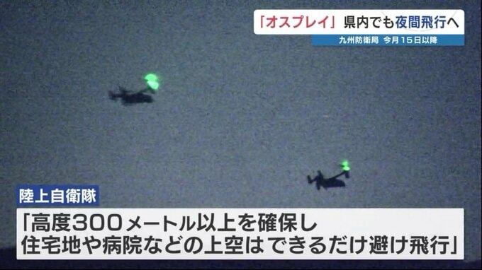 オスプレイをめぐっては、2023年11月に鹿児島県の屋久島沖でアメリカ軍のオスプレイが墜落するなど、事故やトラブルが相次いでいますが、陸上自衛隊は「騒音などに配慮する」「高度300m以上を確保し、住宅地や病院などの上空はできるだけ避けて飛行する」としています。