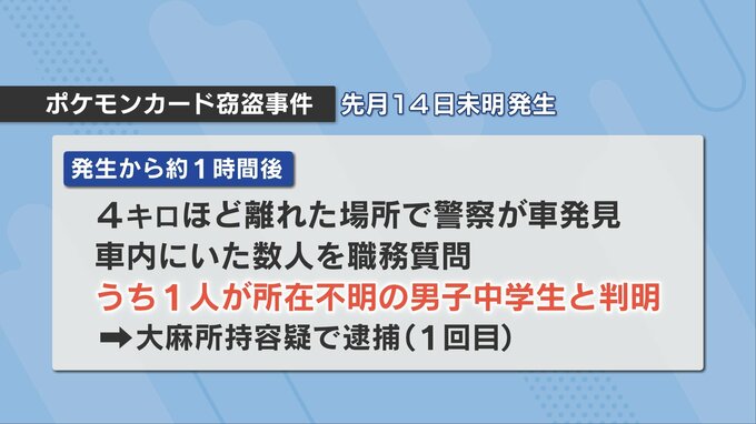 この事件の1時間後、現場から4kmほど離れた場所で、通報時の情報と特徴が一致する車を警察が発見し、職務質問したところ、乗っていたうちの1人が、所在が分からなくなっていた男子中学生と判明したため、大麻所持の疑いで逮捕しました。