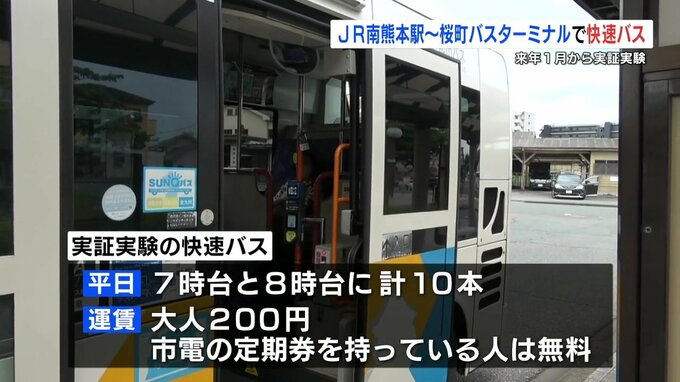 新水前寺駅から市電に乗り換え、市中心部に移動する場合と比べて10分の時間短縮が見込めるということで、熊本市は「実証実験の利用状況を見て、本格運行を検討したい」としています。