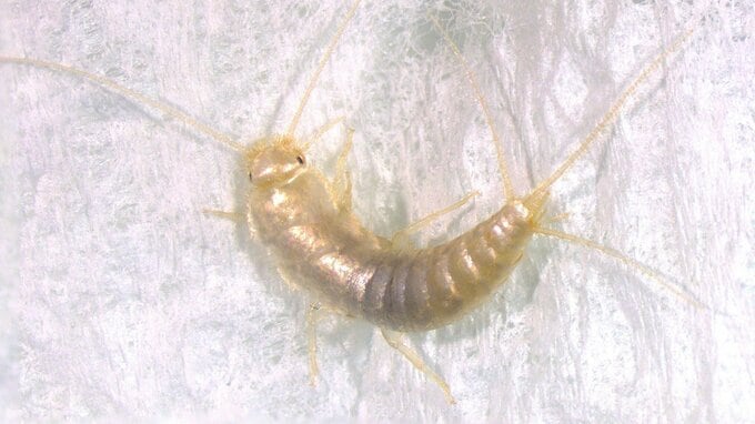 人呼んで「ニュウハクシミ」。その名の通り光沢のある乳白色の体で、体長は約1cm、おしりには3本の毛があります。