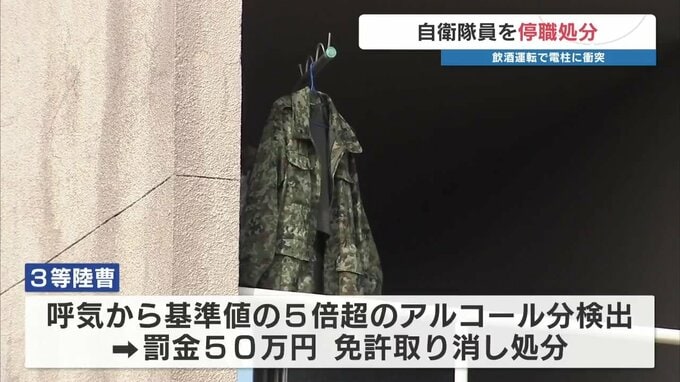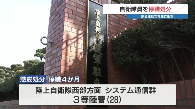 西部方面隊によりますと、3等陸曹は去年8月の未明、熊本市内の一般道で酒気を帯びた状態で自家用車を運転し、ガードレールと電柱に衝突したということです。