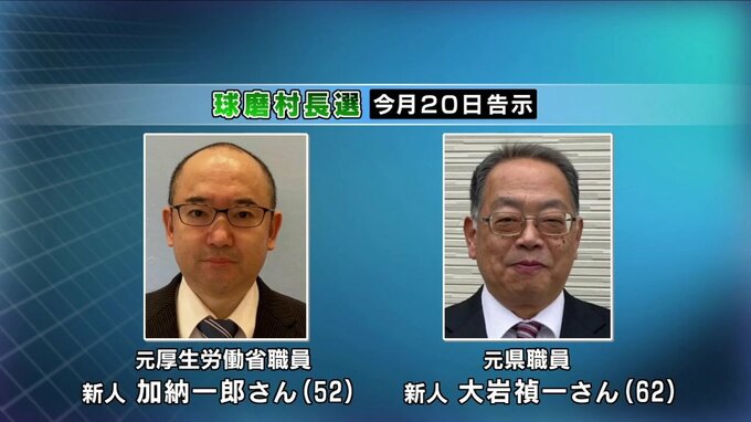 村長選挙にはこれまでに、新人で元厚生労働省職員の加納一郎氏(52)と、新人で元県職員の大岩禎一氏(62)が立候補を表明しています。