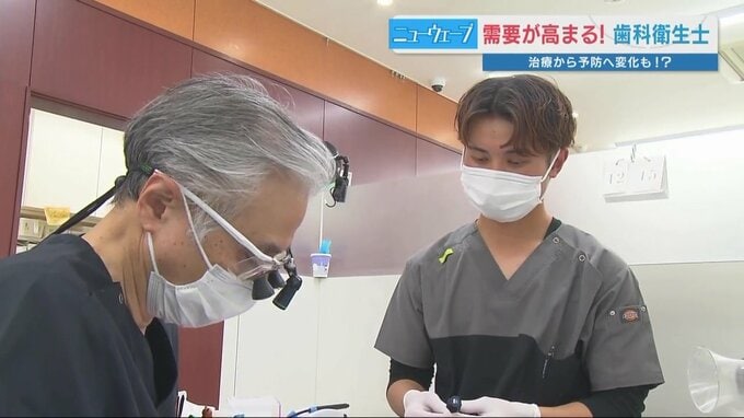 伊藤歯科医院で働く吉川幸長さんは2年前、熊本歯科衛生士専門学院で初の男性卒業生となり、現在は第一線で活躍しています。