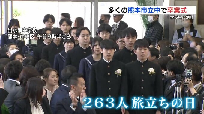 「感謝しています ありがとう」 多くの熊本市立中で卒業式 今年度は6500人が卒業 2026年3月7日(土) 16:23 国内 熊本市立の多くの中学校できょう、卒業式が行われ、学び舎に別れを告げました。熊本市中央区の出水(いずみ)南中学校では、3年生263人が旅立ちの日を迎えました。式では卒業生の代表が成長を支えてくれた保護者たち…