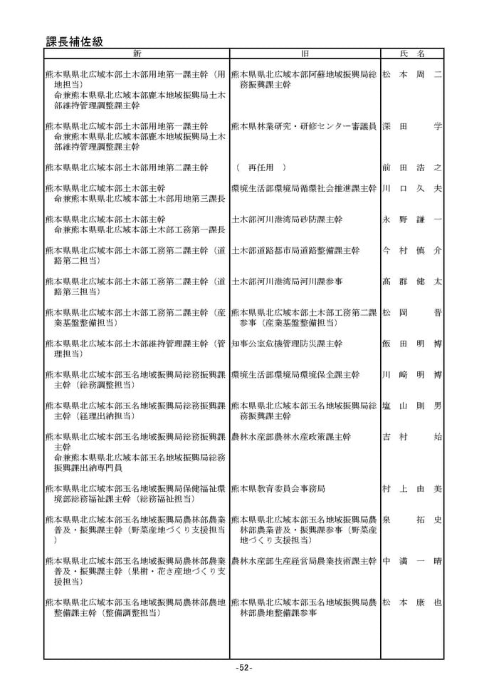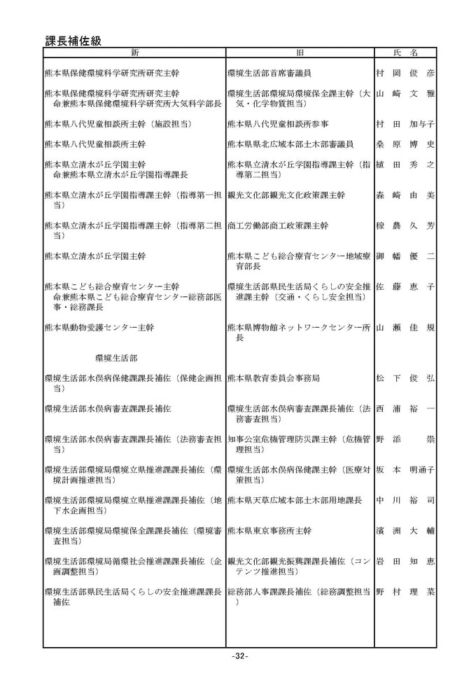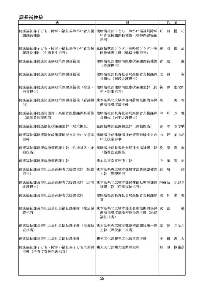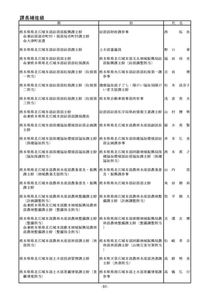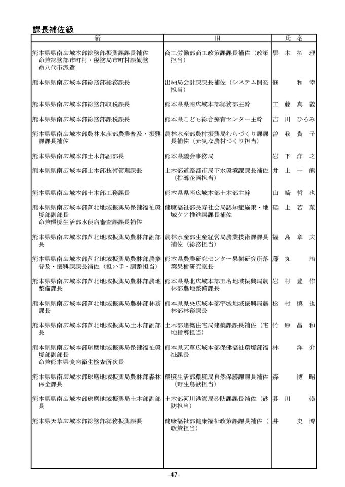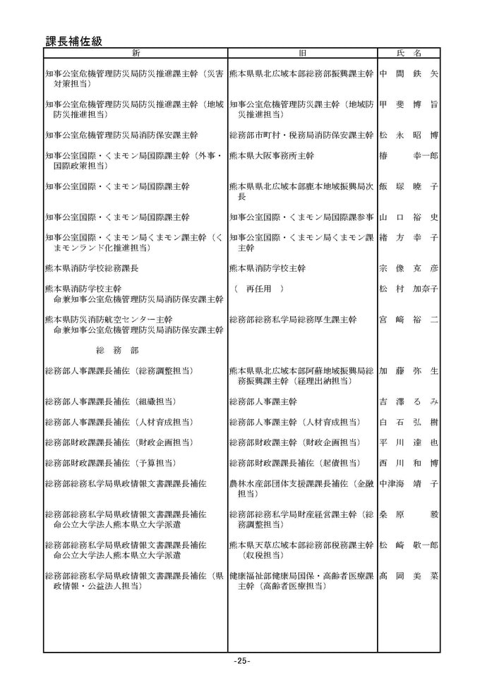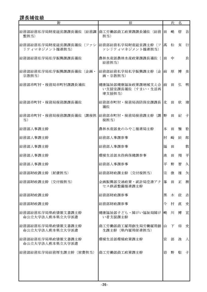 熊本県職員の人事異動一覧2026〈特別職・部長・次長・課長・課長補佐・係長級・年度末退職者【知事部局】〉