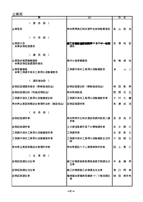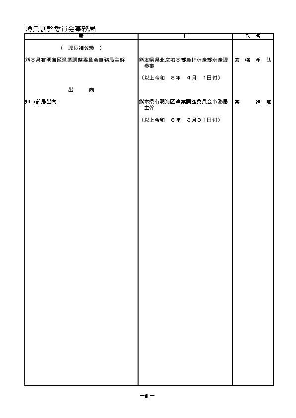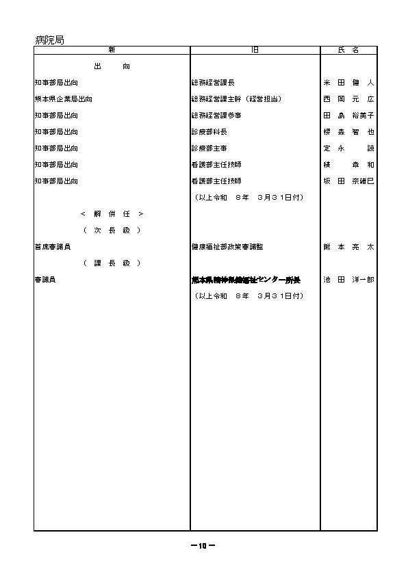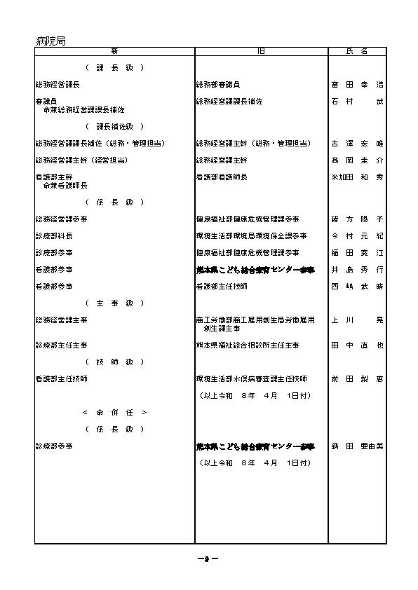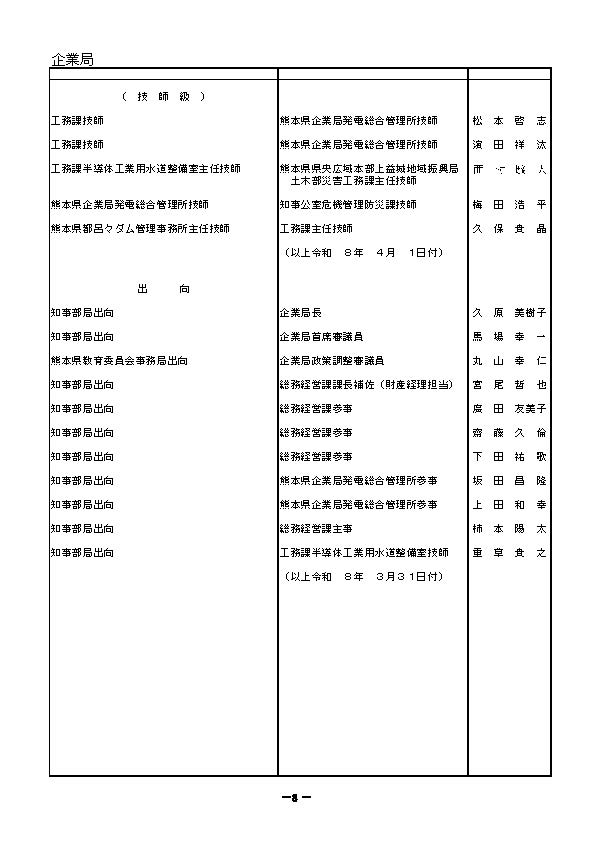 熊本県職員の人事異動一覧2026〈議会事務局・選挙管理委員会・人事委員会事務局・監査委員事務局・漁業調整委員会事務局・企業局・病院局【外局】〉