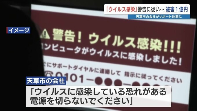 「サポート詐欺」で被害1億円・・・その画面を再現すると!? 対策は「落ち着いて無視」 相談は月に300件とも 2026年3月25日(水) 19:55 国内 あなたのパソコンにもし、こんな画面が表示されたら、どうしますか?熊本県天草市の会社で、パソコンがウイルス感染したと思わせる「サポート詐欺」の被害を受け、約1億円を騙し取られましたが、被害に至らずとも…