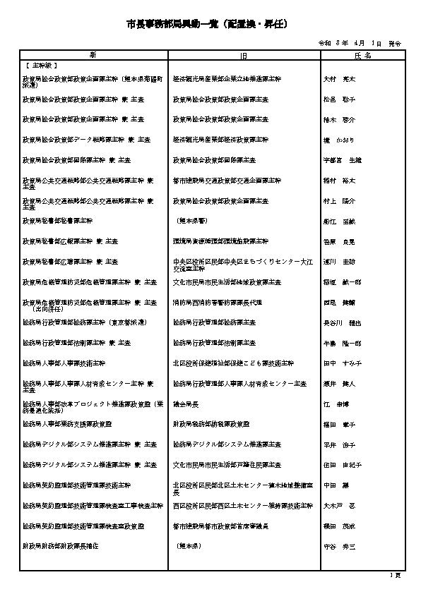 熊本市の職員 人事異動情報2026 〈特別職・局長級~主任級〉〈病院局/消防局/議会局/交通局/上下水道局/教育委員会/監査事務局/人事委員会/選挙管理委員会/農業委員会〉名簿一覧