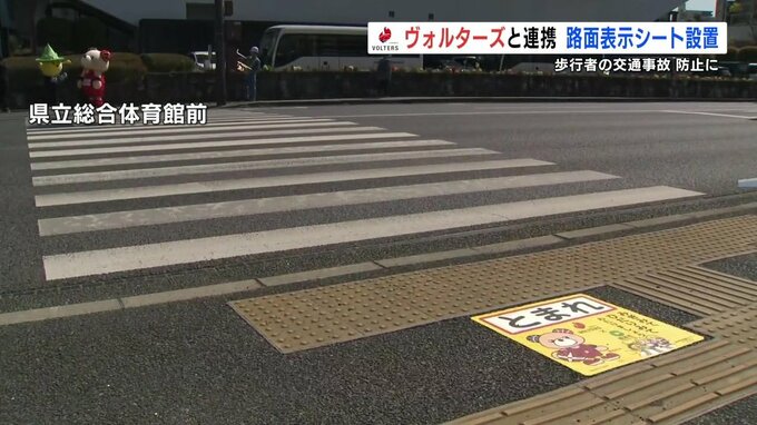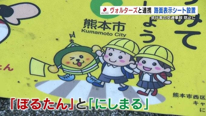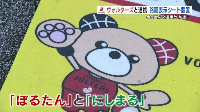 歩行者の交通事故を防ごうと、熊本市の横断歩道に、プロバスケットボールチーム「熊本ヴォルターズ」と連携した路面表示シートが設置されました。