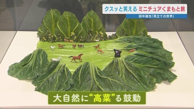 ミニチュア写真家・田中達也〝新聞紙の熊本城〟で故郷を思う クスッと笑えるミニチュアくまもと旅「見立ての世界」 2026年3月26日(木) 19:57 国内 作品名「大自然に『高菜』る鼓動」 阿蘇の名物「高菜漬け」!視線をずらすと・・・草原をのびのびと駆けまわる馬。ここは草千里。周囲にそびえるのは阿蘇の山々です。 食べ物や食器、日用品の中にミニチュア人形を置くと、「別の何か」に見えてくる。