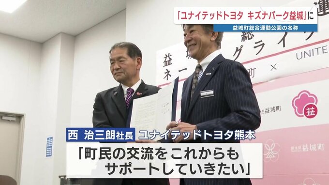 自動車販売会社「ユナイテッドトヨタ熊本」と益城町は3月27日、益城町総合運動公園の命名権についての契約を締結し、新たな名称が発表されました。