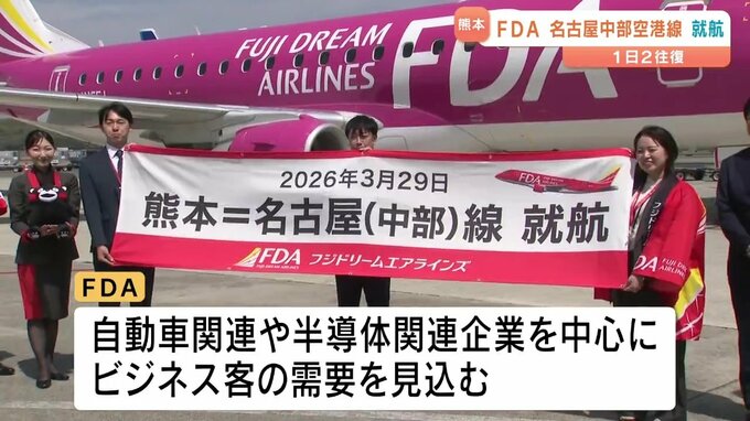 FDA 熊本ー名古屋中部線 就航 ビジネス客の需要見込む 2026年3月29日(日) 18:06 国内 FDA・フジドリームエアラインズの、熊本空港と名古屋中部空港を結ぶ新たな路線が29日就航しました。セレモニーでは、熊本市出身、FDAの本田俊介社長が「就航によって熊本と愛知、お互いのビジネス、観光需要の創出…