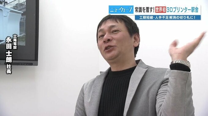 立尾電設 永田士朗 社長「建築をやりたいという気持ちは、実は以前からありまして。とはいえ、本業の方が設備工事なもんですから、簡単には参入できないなと、ある意味諦めていた部分もあったんですけども。プリンターで製作するということ、既存の工法にとらわれないということなので、新規参入しやすいのかなというところに着目して、まずスタートしました」