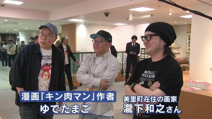 4月19日、鶴屋百貨店で開かれている瀧下さんの個展会場に、キン肉マンの作者「ゆでたまご」の2人が駆けつけました。