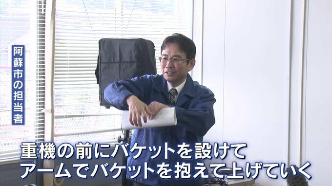 阿蘇市の担当者「重機の前にバケットを設けて、アームでバケットを抱えて上げていく」