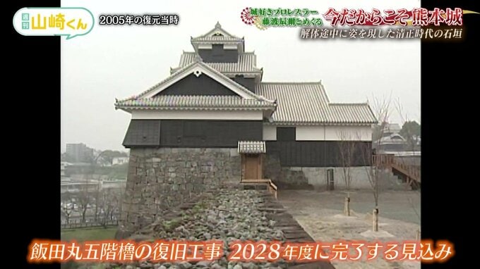 崩れた7万個 "石垣の声"を聴き元に戻す果てなき挑戦 城好きプロレスラー藤波辰爾が見た熊本城復旧の最前線① 2026年4月30日(木) 18:00 国内 櫓の復旧は3年後の予定 熊本城では、時代ごとに石垣を積み重ねる改修が行われていて、その構造が今回の被害で明らかになりました。 城が大好きな藤波さん、新旧の石垣の積み方や構造に興味津々でした。 飯田丸五階櫓の櫓部分の復旧は、2028年度を予定しています。