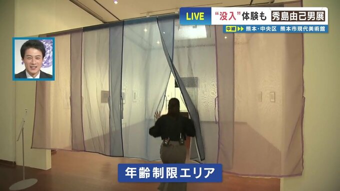まずは、こちらです。美術館にはなかなかないような淡いベールに包まれたエリア。こちら、年齢制限があるんです。18歳以上の方しか入ることができません。つまりはそういうことなんですけれども、テレビでは映せないので私が確認してきます。