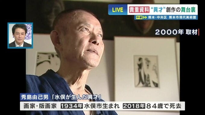 秀島由己男さんは1934年に水俣市で生まれて、中学卒業後は独学で絵画技法を学びました。その後、美術評論家達にその才能を認められ、大きく世に出ることになります。
