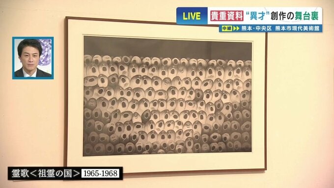 代表作は「霊歌」です。口を縦に大きく開けて歌っている姿のモチーフが、作品にたびたび登場しています。水俣が生んだ異才と称され、戦後日本版画の重要作家の一人として高く評価されています。