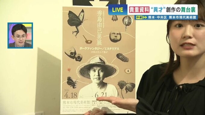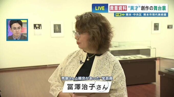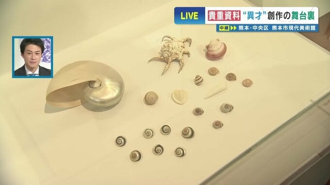 秀島さんと親交があった 学芸員 冨澤治子さん「そうなんです。これは昨年発見されました、秀島由己男さんの貝のコレクションのごく一部なんです。これが一体なぜここで展示されているかといいますと、こちらの作品「思い」。頭が貝で体が女性の作品なんですけれども、この貝のモチーフがこちらの貝からヒントを得たものになっています」