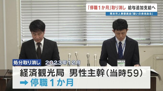 【異例】熊本市人事委が職員の停職処分を取り消し 証言の食い違いで「事実なし」と判断 停職中の給与を支給へ 2026年4月28日(火) 19:13 国内 熊本市の人事委員会は、2023年に停職1か月とした職員への処分を取り消す決定をしました。停職中の給与などは追加で支給するとしています。熊本市人事委員会が取り消したのは、2023年12月に当時59歳の経済観光局の…