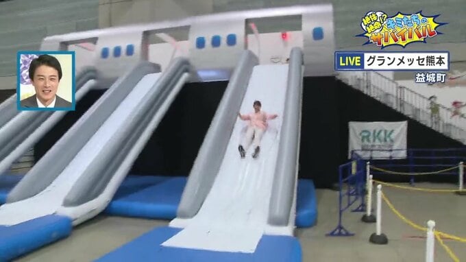 飛行機からの緊急脱出、ジャングルでワニに遭遇!? 絶体絶命にどう立ち向かう「科学漫画サバイバル」シリーズ体験イベント ゴールデンウィークにグランメッセ熊本で開催中 2026年4月30日(木) 19:59 国内 渡辺アナ「何度やってもスリルがあります。機内ビデオで見るアレですよ!」 この会場には絶体絶命のシチュエーションを再現した体験ブースが設けられています。 続いて、渡辺アナが向かったのは…。