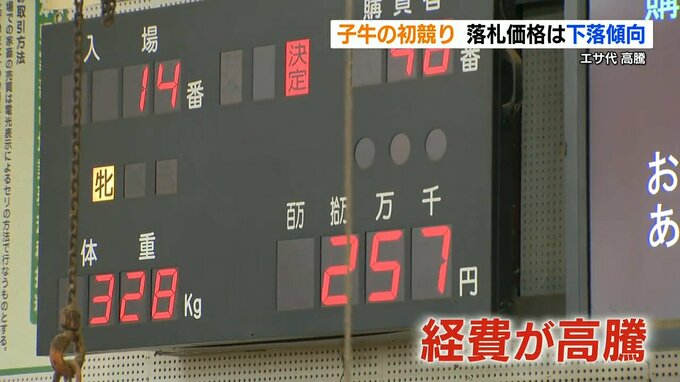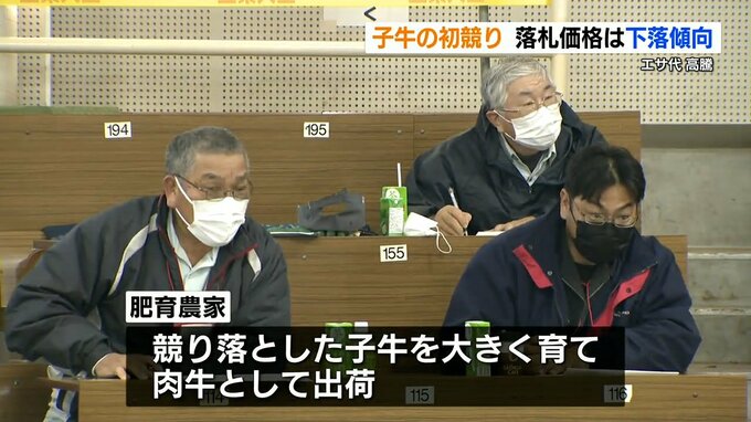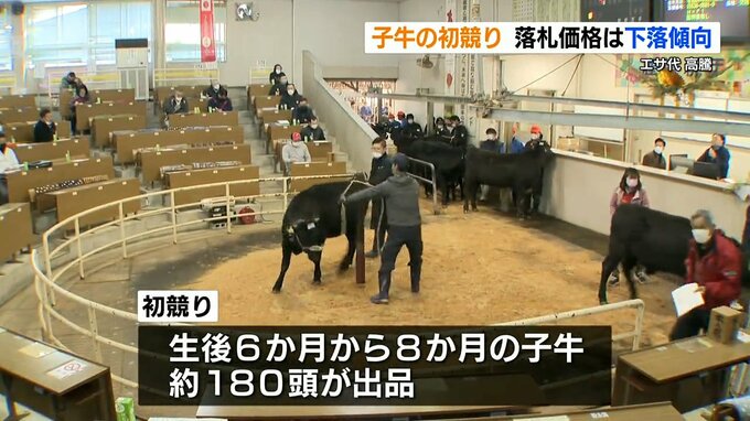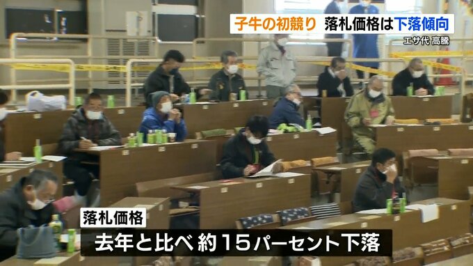 畜産関係者によりますと、ロシアのウクライナ侵攻などの影響で牛のエサ代が1.5倍以上になっていて飼育のための経費が高騰したことから、肥育農家が子牛の購入に多くの予算を割けず、落札価格は去年と比べて15パーセントほど下落しているということです。