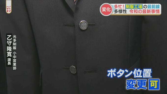 光多制服 小中営業部 乙守 隆寛 課長「こちらのブレザーはどちらも男女兼用型で、ボタンがチェンジ式となっておりますので、生徒自身が希望するところにボタンを入れて着用することが可能となっております」