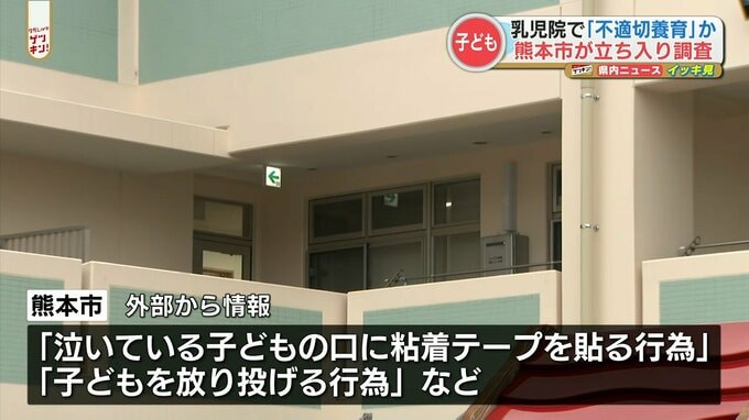 熊本市は、「泣いている子どもの口に粘着テープを貼る行為」や「子どもを放り投げる行為」など、不適切な養育に関する外部からの情報に基づいて業務記録などを確認するためきょう乳児院への調査に着手したということです。
