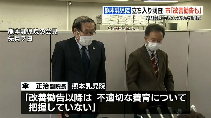 熊本乳児院を巡っては、元職員による発言が心理的虐待と認定され、2022年3月に市から改善勧告を受けていますが、傘 正治(からかさ まさはる)副院長は「改善勧告以降は不適切な養育について把握していない」としています。