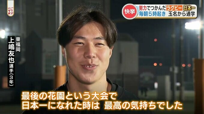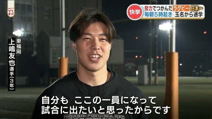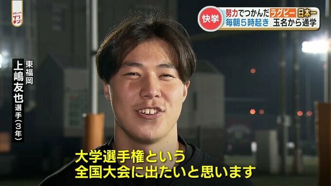 玉名市出身のウイング、上嶋 友也(うえしま ともや)選手(3年)です。決勝で3トライをあげ、報徳学園(兵庫)に41対10と快勝。東福岡の6年ぶり7度目の優勝に貢献しました。