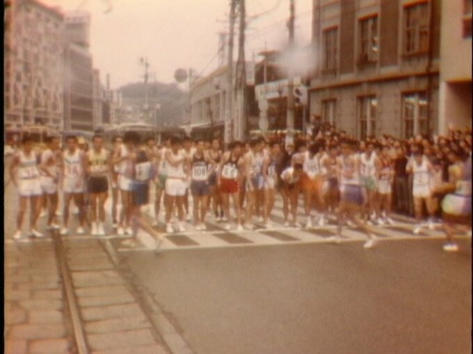 この大会には、新日鉄の君原選手(※2)など日本長距離のトップ選手ら126人が参加しました。午前11時、金栗四三(かなくり しそう)さん(※3)の号砲で熊日前を一団となってスタートしました。