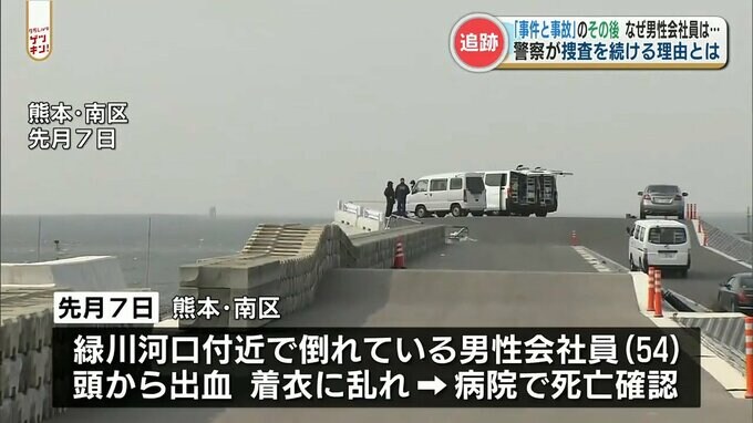 1月7日、熊本市南区の緑川河口付近で54歳の会社員の男性が頭から血を流し着衣が乱れた状態で倒れているのが見つかり、運ばれた病院で死亡が確認されました。