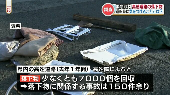 高速道路交通警察隊によりますと2022年の1年間、熊本県内の高速道路で発見された落下物は、プラスチック製品から自動車の部品まで少なくとも7000個が回収されていて、その落下物に関係する事故は、150件余り起きているということです。