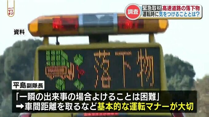 一方で、運転中に落下物に遭遇した場合、平島副隊長は「一瞬の出来事の場合、よけることは困難」とし、「車間距離を取る」ことや「ながら運転」をしないなど、基本的な運転マナーが大切だとしています。