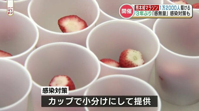 午後になり雨が上がりました。ランナーたちに人気なのがイチゴ。例年は箱に置かれたものを掴み取るスタイルでしたが今年は感染対策のためカップで小分けにして提供されました。